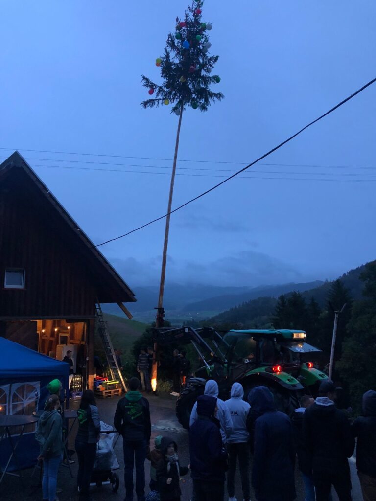 Dank moderner Technik und überragenden Fahrkünsten von Karl-Heinz Schüle wurde auf dem Bergle ein geschmückter Maibaum gestellt. Der Maibaum wurde in den Farben Grün weiß von der DJK Prinzbach und in bunt von den Lustigen Wagenbauern Prinzbach geschmückt, eine gute und nachhaltige Idee einen gemeinsamen Maibaum zu stellen.