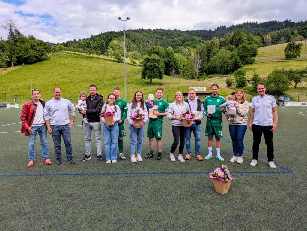 Im Anschluss gab es nach dem letzten Heimspiel der Saison noch zahlreiche Verabschiedungen. Sportvorstand David Beck nahm die Verabschiedung verdienter Spieler vor. Karlheinz Schüle und Fabian Echle sind echte Prinzbacher Eigengewächse welche sowohl in der Jugend als auch im Seniorenbereich Ihre komplette Karriere das Trikot der DJK Prinzbach getragen haben. Leider sorgten schwere Verletzungen für ein zu frühes Karriereende. Dominik Alender kam vor 10 Jahren vom FV Zell zur DJK Prinzbach war stets ein Vorbild an Trainingsfleiß und Einsatz. Die letzten Jahre war er Betreuer der DJK Reserve.